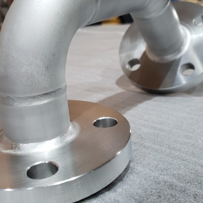 2025年11月18日 ステンレス溶接【90°ベンダーT字管】 ステンレス溶接【90°ベンダーT字管】製作。曲げたパイプに穴をあけ、そこにカットした立ち上がりパイプを組み合わせて作るT字管。展開とすり合わせ、90°を保つ溶接は至難の業。
